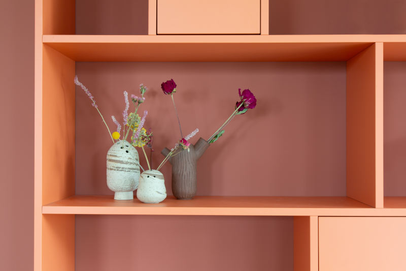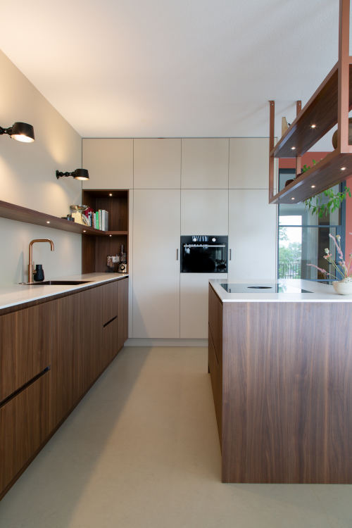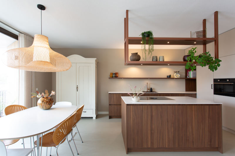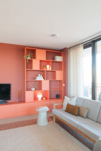 Overall hebben we harmonie in de ruimte gecreëerd door te kiezen voor natuurlijke materialen en kleuren die mooi op elkaar aansluiten en elkaar versterken. Het appartement baadt in het licht door de grote ramen die veel licht doorlaten. Door in het gehele appartement voor een lichte maar toch ook warme kleur marmoleum te kiezen en luchtige gordijnen met een mooie open structuur en soepel vallende, lichtdoorlatende stof krijg je in de basis al een heel mooi licht appartement. De kozijnen worden geleverd in een donkerbruine, warme kleur. . Wij hebben de twee grote wanden die raamloos zijn een warme kleur gegeven. De verf heeft 40% meer pigment dan standaard verven waardoor de reflectie en uitstraling nog krachtiger en mooier is. Één wand krijgt een prachtige gewaagde kleur; warm roodbruin en deze combineert schitterend met de fellere koraalkleurige maatwerkkast. Een waar pronkstuk. De andere wand krijgt een mooie klei kleur die weer heel mooi harmonieert met de walnoten fronten van de lage keukenkasten en het kookeiland. De keuken is een tweede pronkstuk. Het straalt luxe en een goede smaak uit doordat het maatwerk is. Het sluit naadloos op de ruimtes in het appartement aan. Bovendien hebben we mooie en duurzame materialen gekozen; de fineer walnoten fronten combineren prachtig met de duin beige kleurige hoge kasten. Doordat de plinten in dezelfde kleuren worden uitgevoerd en straalt het rust uit. In de ‘loze’ hoek die ontstaat hebben we een mooie open maatwerk schappen kast met verlichting gemaakt. Functioneel en harmonieus, het verbindt de lage en hoge kasten mooi met elkaar. Het kookeiland staat vrij in de ruimte en is oogt daardoor ruimtelijk. Het blad is dun en stijlvol in een duurzaam natuurlijk ogend materiaal vormgegeven. We hebben ervoor gekozen ook de eettafel en zithoek vrij in de ruimte te zetten. Hierdoor lijkt de ruimte groter en heb je mooie open loopruimtes en zichtlijnen. De eettafel staat vrij voor het grote raam, waardoor je heerlijk in het licht zit en naar buiten kunt kijken. Het tv meubel is opbergkast en pronkkast in één. De hoogtes, ook van de plinten worden allemaal op de rest van de ruimte afgestemd, dat geeft rust en harmonie. De lage kasten hebben greeploze lades met push to open systeem.