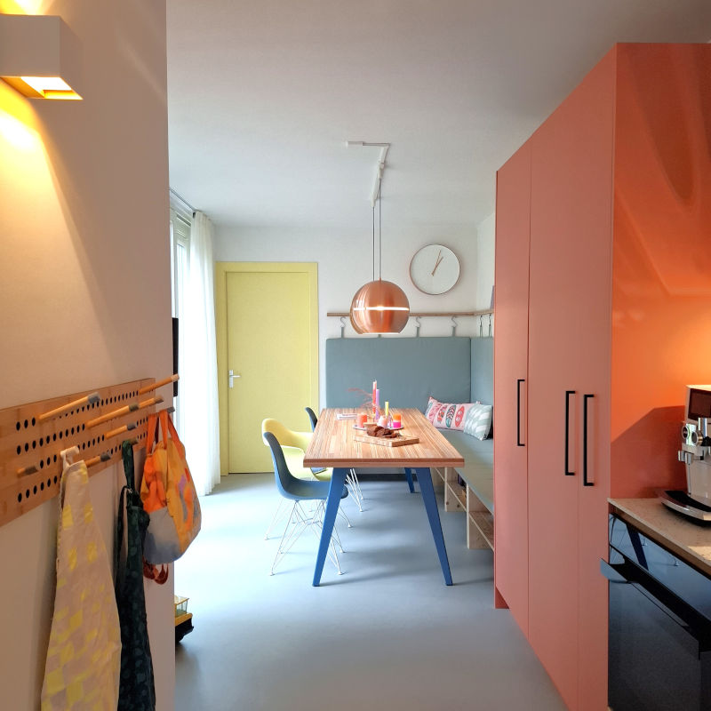 Ik heb de kleuren toegepast met prachtige nuanceverschillen en mooie contrastkleuren die karakter gaan geven en toch rustig ogen. Ik heb de ruimtes overwegend wit gelaten maar met een kleur op het maatwerkmeubel óf een muur. De kleur ‘’Shocking Coral” zorgt voor pit en geeft warmte en karakter. Deze kleur komt subtiel op enkele plekken terug, in een stoel, in een lamp en op de deur naar de bijkeuken. Dit gaat echt een geweldig effect geven. Geen nood, mochten de bewoners er ooit op uitgekeken raken, een muur of deur is zo overgeschilderd. Het gehele huis krijgt rust, licht, karakter en straalt natuurlijkheid zonder dat het saai wordt.