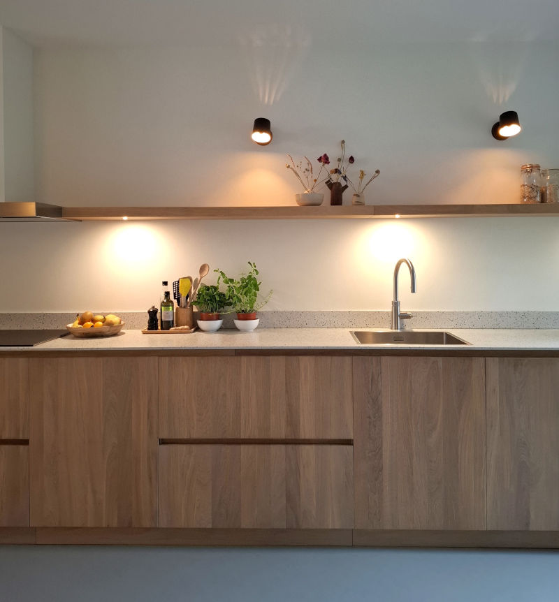 Ze hebben mij gevraagd om de materialen te kiezen en de keuken volledig in te richten. De meubels voor de rest van het huis gaan de bewoners zelf uitkiezen. Ik kon het echter niet laten om toch ook de meubels voor het eetgedeelte uit te zoeken. Omdat dit één geheel vormt met de keuken. Nu hebben ze een totaalplaatje. Het sluit naadloos op elkaar aan. Hierbij heb ik zoveel mogelijk duurzame materialen en meubels toegepast. Ik heb hierbij gelet op de plek waar het gemaakt wordt, zoveel mogelijk uit Nederland, van welk materiaal, of het lang mee gaat en tijdloos is.