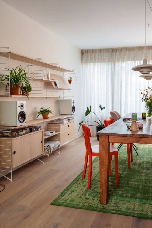 De gordijnen zijn van biologisch, duurzaam linnen van By Mölle. Het zorgt voor warmte, sfeer en een betere akoestiek. Bovendien filtert het biologisch linnen het licht prachtig, het heeft een hele mooie structuur. Ook de kleden, in de woonkamer een mooi melange groen en in de serre het sisal kleed dat al in bezit is, zorgen voor een betere akoestiek.