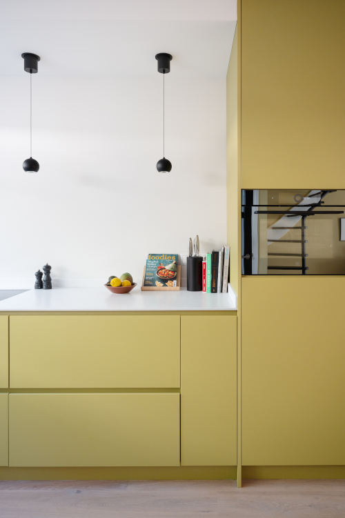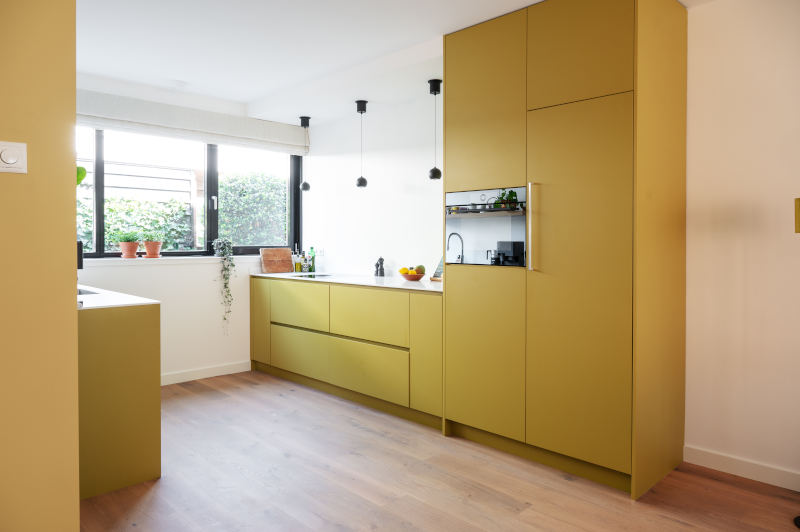 We zijn tot de volgende keuzes gekomen. De keuken is verandert in opstelling, we hebben meerdere opties doorgesproken. Na goed overleg en beraad heb je aangegeven deze mooie open en ruimtelijke opstelling te wensen. Daarbij oogt de keuken overzichtelijk en kijk je vanuit de woonkamer niet direct op het aanrecht. Er is veel werkbladruimte, mede omdat ik de keuken 70 cm diep heb gemaakt. Er zijn twee hoge kasten, verder is alles laag (werkhoogte 95 cm). Doordat er een recirculatie kookplaat komt is een afzuigkap niet meer nodig. Ook heb ik geen bovenkasten geplaatst. Dat zorgt ervoor dat de keuken minder opvallend in het oog springt. Dat komt ook door de keuken in één kleur te ontwerpen, ook de plinten in dezelfde kleur als de fronten. Alleen het blad is onderscheidend en van een duurzaam materiaal dat vormbaar, niet poreus en zeer hygiënisch is. De kleur groen van deze maatwerk keuken komt subtiel terug in de woonkamer door de muur bij de trap in een iets lichtere groen te schilderen. Overigens zijn de muren met de duurzame minerale verf Keim gesaust. Voor goed advies en inkoop van deze verf kan ik je Greenpaints van harte aanbevelen. De overige muren blijven in de woonkamer wit, een bewuste keuze. Hiermee oogt de ruimte licht en rustig, de meubels krijgen kleur en geven het warme en opvallende kleuraccent. De eettafel verhuisd naar wat nu de woonkamer is. Hij staat hiermee volop in het licht, dit is immers de plek waar je het meeste tijd doorbrengt en het mooiste zicht op de tuin hebt. De verbinding met de keuken is zo ook een stuk praktischer en fijner. Bovendien komt er een hippe, tijdloze, modulaire wandkast die middels rekken op de muur wordt bevestigd. Het is een onopvallend en licht frame gecombineerd met houten kast en planken. Hierin kun je veel mooie accessoires, knutselspullen en boeken kwijt. De zithoek met tv verhuisd naar de minst lichte plek van het huis, zodat het een geborgen plek wordt waar de ander ook minder last heeft van het geluid. De kamer waar de tv en de leeshoek komt is vrij donker en krijgt juist daarom veel kleur. Het zijn warme, contrasterende kleuren. Hier ontstaat een hele warme en geborgen plek. De woonaccessoires, zoals een felgele bijzettafel, de wandobjecten van Saris van Twillert en de kussens, geven lekkere opvallende kleurcontrasten. Deze kleuren komen overal subtiel in het interieur terug. Zo is er wel veel kleur, maar wordt het niet onrustig en is er sprake van harmonie. Alle kleuren matchen mooi met elkaar. De houten vloer blijft en wordt in een lichte (iets wit accent) kleur geolied, nadat hij eerst wordt geschuurd. De basis is daardoor heel licht en modern. In de hal en keuken komt vloerverwarming, waardoor de radiator weg kan. Dat geeft al meer rust.