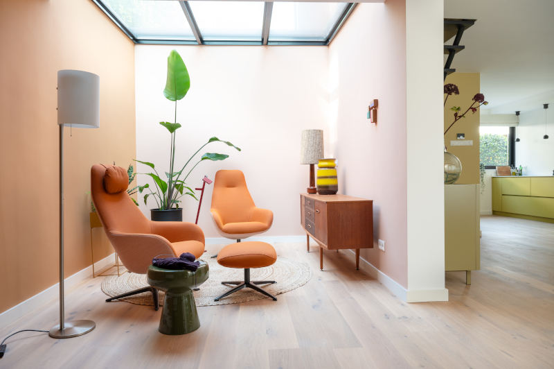 In de leeskamer, onder de lichtkoepel, komen twee fijne design fauteuils. Ik heb een mooie stof, tweekleurig uitgekozen die prachtig harmonieert en licht contrasteert met de muur. In de tv-kast, die zwevend wordt opgehangen en ruimte heeft om stekkers en bedrading weg te werken, komt een geel accent. Hiermee wordt het bepaald niet saai.
