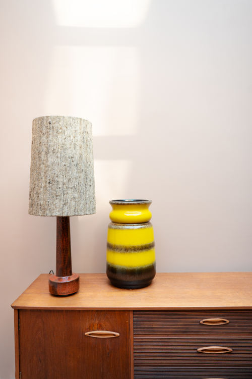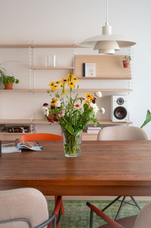 In de keuken komt op de houten plank een seventies gekleurd servies en mooi, recycled glas. Ook een hangplantje voor een gevoel van welzijn en sfeer van natuur. Op de wand van de kookplaat komt een mooi wandobject, een IXXI in de kleuren oranje, rood en geel. Dit geeft de keuken kleur en een knipoog. Iets waar je ook naar verlangt.
